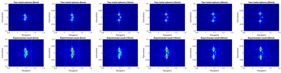 To demonstrate the effectiveness and performance of the proposed method, we present results of numerical simulation and experimental measurement that were briefly outlined in the preceding section. The experiments are set in an anechoic chamber and two metal spheres are placed in the scene center with spacings of 0 mm, 5 mm, 10 mm, 15 mm, 20 mm and 25 mm. An N5224A PNA microwave network analyzer is used as a transmitter and receiver in this experiment. The system applies the motion controller to acquire data with a 1 cm interval in the total 1 m synthetic length. After collecting the raw data, focusing is carried out to obtain the focused images. In Figure 17, the results from the full-wave method compare well with the experimental results. The approach preserves the electromagnetic wave interactions between two spheres, and the interaction is reduced with spacing increases. Different degrees of interaction are present with the spacing variation between the targets, and the interaction intensity is reduced with increasing displacement.
