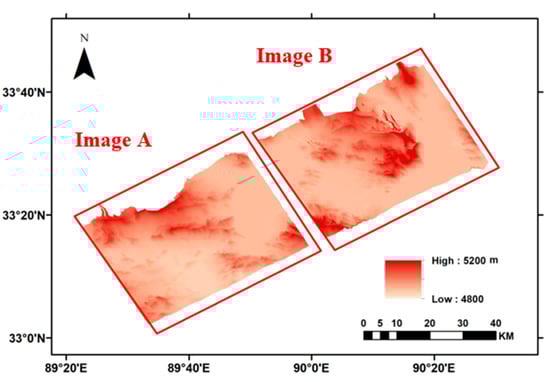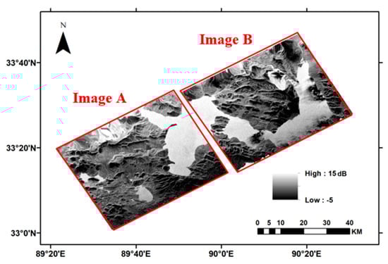 For this study, the VV-polarized SAR backscatter images (Figure 1) acquired by InIRA of the study region on 23 September 2016 were used for mapping lake extent. The two images (Images A and B of Figure 1) sequentially acquired by InIRA were Level 2 scientific data with radiometric and geometric calibrations conducted and downloaded from Space Application Data Promoting Service Platform for China Manned Space Engineering (http://www.msadc.cn). As seen in Figure 1, the backscattering coefficients range from −5 to 15 dB and the overall bright lake areas are generally distinguishable from the surrounding darker land areas. However, geometric distortions are found over the northern edges of the images. The layover and shadow regions which are typical to the SAR observations over mountainous areas are also shown in the two images.