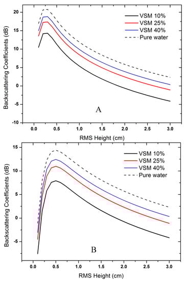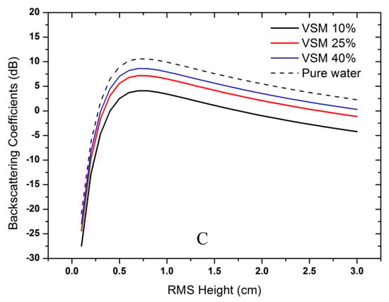 Radar backscattering coefficients changes with surface roughness for incidence angle (A) 2°; (B) 5° and (C) 8°. VSM, volumetric soil moisture.