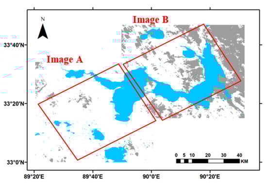 The study region (within the red rectangles of Figure 1) was located within Nagqu prefecture of Tibet Autonomous Region, China, covering about 3600 km2 area. The natural environment of the region is cold and dry, typical of that of the Northern QTP where elevations are normally higher than 4000 m and annual precipitation is as low as 247.3 mm [1,25]. Major lakes within the study areas include Que’er Caka, Khongnam Tso, Dorosidong Co, Maqiao Co., and Chibzhang Co. Most of the lakes in the regions are saline lakes [26,27]. Due to the scarce of precipitation, glaciers of the region provide important water supplies to many lakes; the lake area changes are affected by factors such as glacier retreat, permafrost degradation, and climate pattern changes [1,26,27]. The two largest lakes of the region are Dorsoidong Co (center latitude 33.41°, longitude 89.88°) and Chibzhang Co (center latitude 33.47°, longitude 90.34°), both of which are glacier-fed lakes undergoing expansions and interlinked with other in recent years [26].