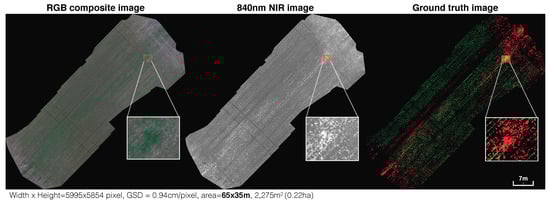 An example of the orthomosaic maps used in this paper. Left, middle and right are RGB (red, green, and blue). composite, near-infrared (NIR) and manually labeled ground truth (crop = green, weed = red) images with their zoomed-in views. We present these images in order to provide an intuition of the scale of the sugar beet field and quality of data used in this paper.