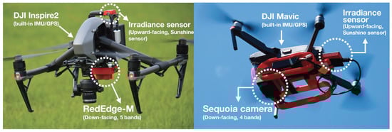 Multispectral cameras and irradiance (Sunshine) sensors’ configuration. Both cameras are facing-down with respect to the drone body and irradiance sensors are facing-up.
