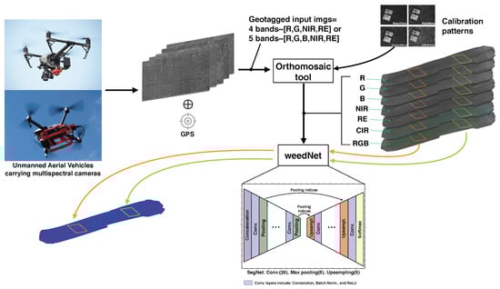 Since these orthomosaic images are true to scale (metric), all bands are correctly aligned. This enables using tiled multispectral images as inputs to the subsequent dense semantic segmentation framework presented in Section 3.4. Figure 8 illustrates the entire pipeline implemented in this paper. First, GPS tagged raw multispectral images (five and four channels) are recorded by using two commercial quadrotor UAV platforms which fly over sugar beet fields. Predefined coverage paths at 10m with 80% side and front overlap between consecutive images are passed to the flight controller. The orthomosaic tool [] is exploited to generate statistics (e.g., GSD, area coverage, and map uncertainties) and orthomosaic reflectance maps with the calibration patterns presented in Section 3.3. Based on these reflectance maps, we compose orthomosaic maps, such as RGB, CIR, and NDVI, and tile them as the exact input size for the subsequent dense semantic framework, weedNet [], to avoid downscaling. The predictive output containing per-pixel probabilities for each class has the same size as that of the input, and is returned to the original tile location in the orthomosaic map. This methodology is repeated for each tile to ultimately create a large-scale weed map of the target area.