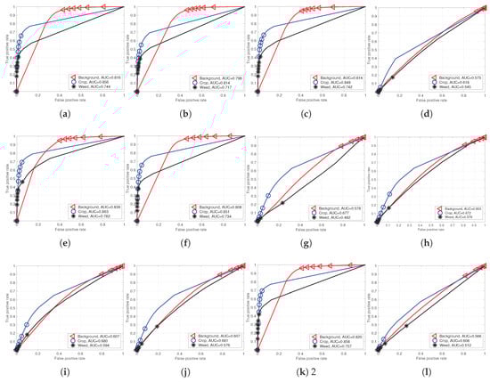 where , , , are the four fundamental numbers, i.e., the numbers of true positive, true negative, false positive, and false negative classifications for class c. The outputs of the network (480 × 360 × 3) are the probabilities of each pixel belonging to each defined class. For example, the elements [1:480, 1:360, 2] [] correspond to pixel-wise probabilities for being crop. To calculate , , , , these probabilities should be converted into binary values given a threshold. Since it is often difficult to find the optimal threshold for each class, we exploit perfcurve [] that incrementally varies thresholds from 0 to 1 and computes , , and the corresponding AUC. We believe that computing AUC over the probabilistic output can reflect classification performance better than other metrics [].