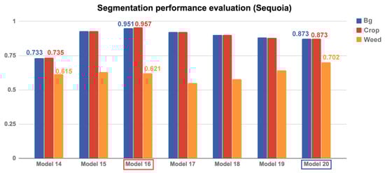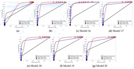 Table 5 displays the dense segmentation results using 20 different models, varying in the number of input channels, batch size, class balance flag, and AUC of each class. Model numbers 1–13 and 14–20 denote the RedEdge-M and Sequoia datasets, respectively. Bold font is used to designate the best scores. Figure 9 and Figure 10 show the AUC scores of each class for the RedEdge-M dataset models and their corresponding AUC curves. Analogously, Figure 11 and Figure 12 depict the AUC scores for the Sequoia dataset models and their AUC curves. The following sections present a detailed discussion and analysis of these results.