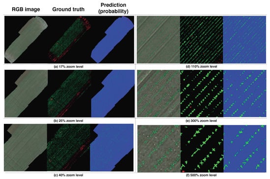 Figure 5 exemplifies the RGB channel of an orthomosaic map generated from data collected with a RedEdge-M camera. The colored boxes in the orthomosaic map indicate areas of different scales on the field, which correspond to varying zoom levels. For example, the cyan box on the far right (68 × 68 pixels) shows a zoomed view of the area within the small cyan box in the orthomosaic map. This figure provides qualitative insight into the high resolution of our map. At the highest zoom level, crop plants are around 15–20 pixels in size and single weeds occupy 5–10 pixels. These clearly demonstrate challenges in crop/weed semantic segmentation due to their small sizes (e.g., 0.05 m weeds and 0.15 m crops) and the visual similarities among vegetation.