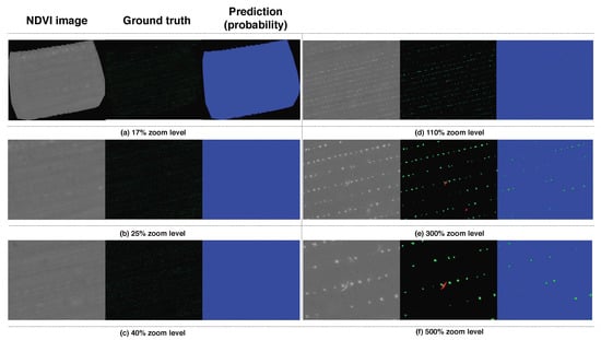 In terms of speed, network forward inferencing takes about 200ms per input image on a NVIDIA Titan X GPU processor, while total map generation depends on the number of tiles in an orthomosaic map. For example, the RedEdge-M testing dataset (003) took 18.8 s (94 × 0.2), while the Sequoia testing dataset (005) took 42 s. Although this process is performed with a traditional desktop computer, it can be accelerated through hardware (e.g., using a state-of-the-art mobile computing device (e.g., NVIDIA Jetson Xavier []) or software improvements (e.g., other network architectures). Note that we omit additional post-processing time from the total map generation, including tile loading and saving the entire weed map, because as these are much faster than the forward prediction step.
