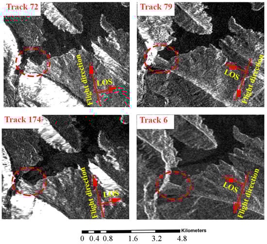 In Figure 3, the dam is indicated with red circles. The downstream slope of the dam and the terrain slopes facing to the radar LOS, look brighter than the other areas in the single-look complex (SLC) image. This is because the foreshortening increases the radar intensity (having more backscatter returned into a single pixel yield more intensity); the foreshortening factor R for slopes facing the radar is smaller than that for the slopes facing away from the radar LOS. Although tracks 72 and 174 are from the same ascending pass, those slopes look brighter in track 72. This is because the SLC image subset in Figure 3 is located in the far range of track 72, while it is in the near range of track 174. In other words, their incidence angles are different, leading to different foreshortening impacts.