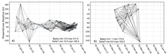 The perpendicular baseline network for a small baseline subset (SBAS) time series (a) before the earthquake and (b) after the earthquake.