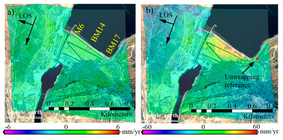 (a) The mean linear velocity estimated from Sentinel-1A/B before the earthquake event, during the period from 30 October 2014 to 7 November 2017, (b) the mean linear velocity after the earthquake, during the period from 19 November 2017 to 7 March 2018. Note that (i) the earthquake occurred on 12 November 2017 at 18:18 UTC, (ii) the reference point for phase unwrapping is indicated by the red dot in the abutment southeast of the dam, and (iii) positive implies that the Earth’s surface moved away from the radar sensor (i.e., subsidence in the radar line of sight), and negative implies uplift in the radar LOS.