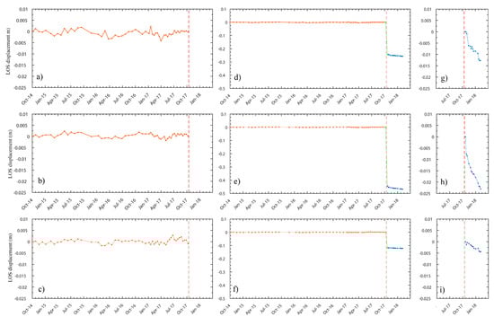 The LOS displacement of two time series: from October 2014 to March 2018 of three points on the Darbandikhan dam crest: M6 (top row), BM14 (middle row), and BM17 (bottom row). The location of each point is indicated in Figure 5a. (a–c) The time series of the displacement before the earthquake. (d–f) The time series before and after the earthquake is connected using the co-seismic movement estimated from GPS and levelling. (g–i) The post-seismic movement estimated from the SBAS time series. The ranges of panels (a–c) and (g–i) are identical. Note, to be consistent with GPS and levelling displacements, interferometric synthetic aperture radar (InSAR)-derived displacements were multiplied with −1, so that positive implies that the Earth’s surface moved towards the radar sensor (i.e., uplift in the radar LOS), and negative implies subsidence in the radar LOS.