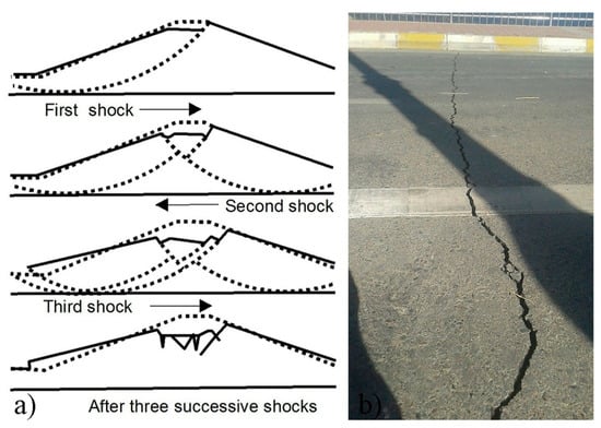 (a) The suggested mechanism of embankment dam behaviours during successive earthquake shakings [6], which is believed to be the case for the Darbandikhan dam; (b) one of the major cracks that emerged in the Darbandikhan dam after the earthquake.