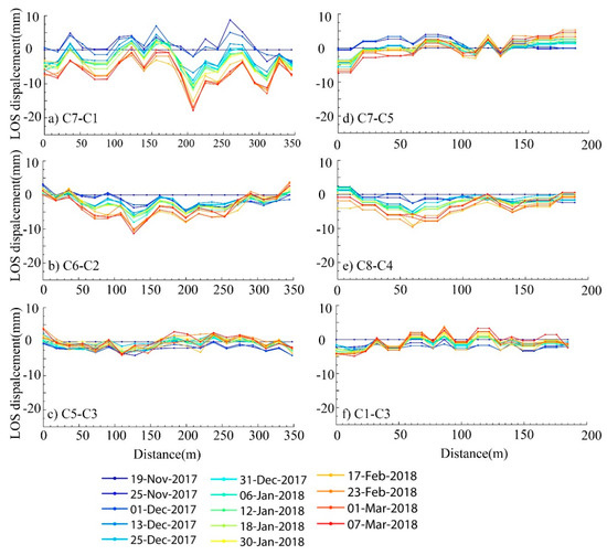 Cross-sections of InSAR-derived LOS displacement time series during the period from November 2017 to March 2018. (a) C1–C7, (b) C6–C2, (c) C5–C3, (d) C7–C5, (e) C8–C4, and (f) C1–C2. Note (i) negative values indicate that the surface moved away from the satellite radar; (ii) the location of each cross-section is shown in Figure 7a.