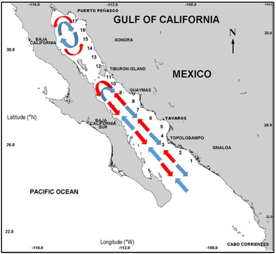 Map of the Eastern Coastal Zone of the Gulf of California showing the location of the sampling points where monthly sea surface temperature (SST) was measured for environmental and oceanographic analyses. Ocean surface circulation: Warm period (red) and cold period (blue) [38].