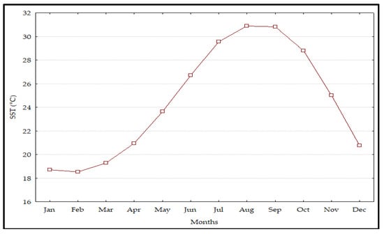 The coastal zone SST rapidly increases from minimum values of 18 to 20 °C (January and February) to maximum temperatures of 30 to 32 °C (August and September). Two well defined periods were observed in the annual SST pattern for the Eastern Coast of the Gulf of California: Warm period with SST higher than 25 °C, and cold period with SST lower than 25 °C, May–June and November are transitions periods with temperatures around the 25 °C (Figure 3).