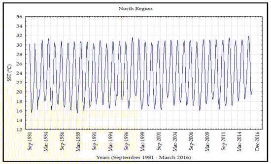 When analyzing SST variability, it is important to study its trends of change associated with environmental modifications that can occur of a natural or anthropogenic form [17]. From this perspective, remote sensing is a technique that can provide a high temporal resolution with a wide coverage of environmental variables; besides, their cost is lower than in situ measurements from boats that are not considered optimal when looking for long and large regions. The use of satellite images, through remote sensing, has allowed having accurate information on a global scale describing the physical and biological aspects of the oceans [18]. One of the disadvantages of remote sensors are uncertainty of SST retrievals in the presence of clouds, atmospheric gases and aerosols [19]. The analysis of SST in marine environments can be a challenge due to the variety of available remote sensors characteristics and resolution (spatial, spectral, radiometric and temporal). The coastal areas are sites with large spatial and temporal fluctuations, showing a high complexity, their study requires the analysis of high-resolution processes [20,21]. Remote sensing provides adequate resolution of SST, a very important variable in oceanography that contributes to their long-term studies [20].