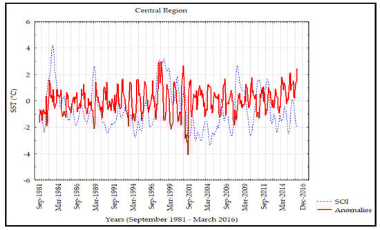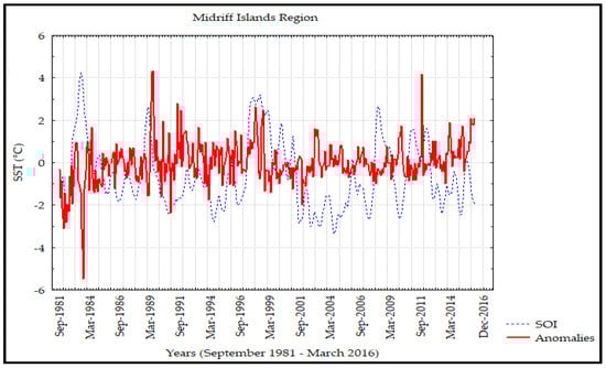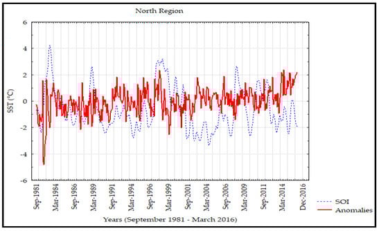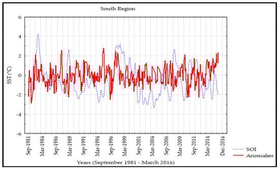 The SST anomalies varied from −5.5 to 4.3 °C. The South Region has the narrowest range between −2.9 and 2.8 °C (Figure 9) and the Midriff Islands Region showed the widest range of values between −5.5 and 4.3 °C (Figure 10). The Central and North Region anomalies varied from −4.1 to 2.9 °C (Figure 11) and −4.8 and 2.4 °C (Figure 12). The SST anomalies were compared with a database of Southern Oscillation Index (SOI) from the Equatorial Pacific Ocean downloaded from ClimateDateGuide (https://climatedataguide.ucar.edu/climate-data/nino-sst-indices-nino-12-3-34-4-oni-and-tni) with a range between −3.4 and 4.2 indicating that the positive anomalies are associated to El Niño event and a negative anomalies are associated to La Niña event.