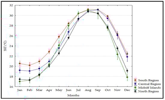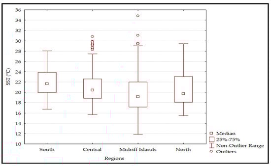 For the comparison of the monthly SST values in the warm and cold period between the four regions, a Kruskal-Wallis test was performed. The monthly SST values of the warm period between these regions were not statistically different (p = 0.7763); however, the monthly SST winter values were statistically different (p < 0.0001). Differences of monthly SST mean of the cold period values were confirmed by a Bonferroni multiple comparison post hoc test. Significant p values (2-Tailed) are denoted with an asterisk in Table 6, where can be observed that only North and Central Regions are not statistically significant.