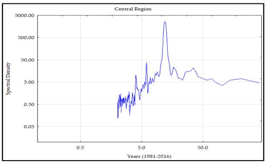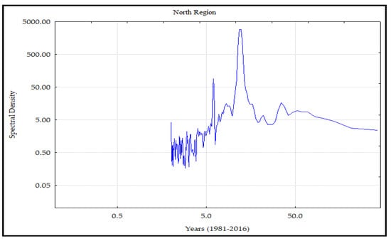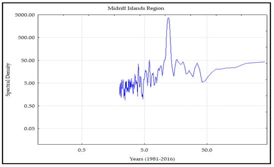 The SST spectral analysis of the regions (Figure 17, Figure 18, Figure 19 and Figure 20) showed that the main frequencies are annual associated with maximum levels in summer and minimum levels in winter, semiannual (six months), and also interannual (periods of three to five years), whose frequencies of variation are associated to global climatological-oceanographic phenomena such as El Niño and La Niña. In addition to all these frequencies, also a seasonal variability can be observed in some regions (South, Central and Midriff Islands), but not at the North Region. The spectral analysis showed an increase in the semiannual frequency from the South to the North Region as well an increase in the seasonal frequency in the Midriff Islands Region reaching almost the same semiannual spectral density level. The interannual frequency rise in the Midriff Islands Region, as well, a possible rise of the decadal frequency.