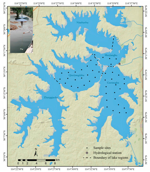 Lake Liangzi (30°5′–30°18′N, 114°21′–114°39′E), which has a water surface area of 362.5 km2, a catchment area of 3260 km2, a mean water depth of 3.0 m, and a water volume of 12.65 × 108 m3, is the largest shallow lake in Hubei Province, historically, China. Lake Liangzi is a macrophyte-dominated lake in the middle and lower reaches of the Yangtze River but the macrophytes have degraded in the past few decades [23,24]. The mean water level of Lake Liangzi is 18.01 m. From 2007 to 2016, two major floods occurred in Lake Liangzi in 2010 and 2016. The maximum water levels of Lake Liangzi in 2010 and 2016 were 21.29 m and 21.49 m, respectively. Lake Liangzi is the backup potable water source of Wuhan. However, in recent years, some areas of Lake Liangzi have become lightly eutrophic [25].