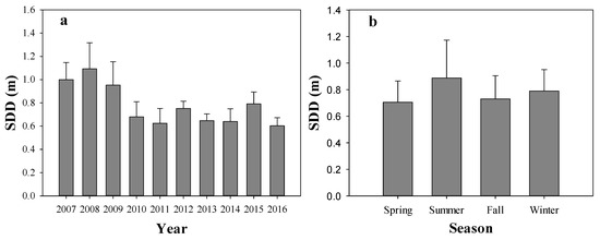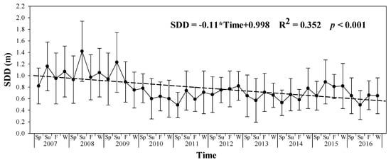 The developed SDD estimated algorithms were applied to forty Landsat ETM+ and OLI images to retrieve SDD values in Lake Liangzi from 2007 to 2016. Then mean and standard deviation values of the SDD were extracted to explore variation trends. The results of the Mann–Kendall test indicated that the SDD in Lake Liangzi showed a significant declining trend during the study period (Z = −3.069, p = 0.002) (Table 3). The results of the linear regression indicated that the SDD in Lake Liangzi showed a significant declining trend from 2007 to 2016 (R2 = 0.352, p < 0.001) (Figure 3). The mean seasonal SDD was highest in summer, with a value of 0.89 m, and lowest was in spring, with a value of 0.71 m, during the study period (Figure 4). However, the SDD in Lake Liangzi did not present a significant seasonal variation (p = 0.201).