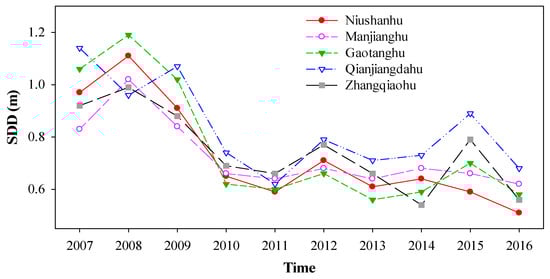 The SDD of small lake bays was lower than the center of lake (Figure 5). The SDD of Qianjiangdahu region was usually higher than other regions in Lake Liangzi (Figure 5 and Figure 6). The SDD of Niushanhu was usually lower than other regions (Figure 5 and Figure 6). The SDD of five lake regions experienced a declining trend the same as the whole lake (Table 3, Figure 6). Furthermore, the SDD of Gaotanghu and Niushanhu decreased much more and much faster than other regions (Figure 6).