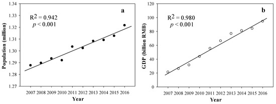 The increase in (a) population and (b) GDP in the Lake Liangzi basin from 2007 to 2016.