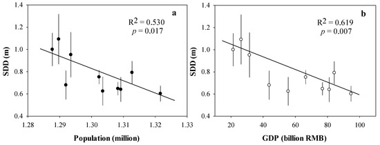 The population of the Lake Liangzi basin experienced a slow but significant growth from 1.288 million people in 2007 to 1.322 million people in 2016 (R2 = 0.942, p < 0.001; Figure 7a). The GDP of the Lake Liangzi basin showed significantly rapid growth from 21.38 billion yuan in 2007 to 94.60 billion yuan in 2016 (R2 = 0.980, p < 0.001; Figure 7b). To evaluate the relationship between the SDD and anthropogenic activities, linear regressions of the SDD with population and GDP were conducted. Significant negative correlations were observed when comparing the annual mean SDD in Lake Liangzi with population (R2 = 0.530, p = 0.017 < 0.05; Figure 8a) and GDP (R2 = 0.619, p = 0.007 < 0.01; Figure 8b).