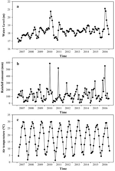 Variation in (a) monthly mean water levels, (b) monthly rainfall amounts, and (c) monthly mean air temperature in Lake Liangzi from 2007 to 2016.