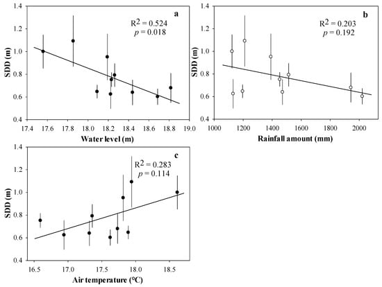 Correlations of the SDD with (a) water level, (b) rainfall amount, and (c) air temperature. Error bars represent SDD standard deviations.