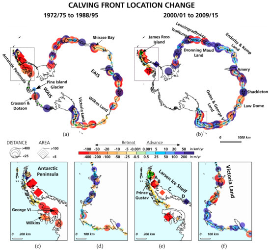 - Kim, K.T.; Jezek, K.C.; Sohn, H.G. Ice shelf advance and retreat rates along the coast of Queen Maud Land, Antarctica. J. Geophys. Res. Oceans 2001, 106, 7097–7106. [Google Scholar] [CrossRef]