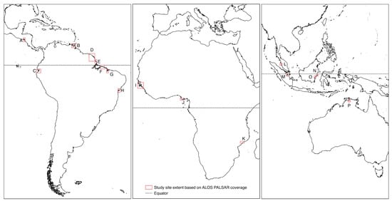 The distribution of the study sites based on the extent of the ALOS 1 tiles. (A) Gulf of Fonseca, Honduras (B) Gulf of Paria, Venezuela (C) Guayaquil, Ecuador (D) French Guiana (E) Amapá, Brazil (F) Bragança (Pará), Brazil (G) Sáo Luis, (Maranhäo), Brazil (H) Baia de Todos os Santos, Brazil (I) Guinea Bissau (J) Niger Delta, Nigeria (K) Zambezia, Mozambique (L) Perak, Malaysia (M) Riau, Indonesia (N) Mahakam Delta, East Kalimantan (O) Balikpapan, East Kalimantan (P) Kakadu National Park, Australia.