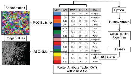An overview of the segmentation and classification process facilitated by RSGISLib and the KEA file format with supported Raster Attribute Table (RAT). Input imagery is segmented and image values are populated into the RAT using descriptive statistics (i.e., mean) using RSGISLib. Each row is an image object and each column is an image attribute. Columns are read as Numpy arrays and can be manipulated (e.g., classified) as desired using python. Subsequent arrays can be populated back into the RAT and can be exported as an image.