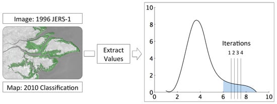The automated detection of changes from the 2010 baseline to the JERS-1 (1996–2010) and 2010 baseline to earliest ALOS PALSAR (2007–2010) imagery was achieved, but the detection of changes between annual ALOS PALSAR imagery (2007–2008, 2008–2009, 2009–2010) was initially unsuccessful. This was due to the narrow class distribution derived from the ALOS PALSAR imagery exacerbated by the change objects typically composing <1% of the objects between consecutive ALOS years. To enhance the separability of the annual change features from the distribution, we normalized the object values between images by taking the ratio of the two scenes. The ratio of images divides one image by another, normalizing the imagery and providing a wider distribution over which to detect anomalies. This combined an image-to-image technique within a map-to-image approach. The ratio threshold was subsequently selected automatically by iteratively removing the tail of the distribution and testing its normality, but due to the consistency of the annual ALOS data [50] a value of 2.5 was selected for each class at each study site.