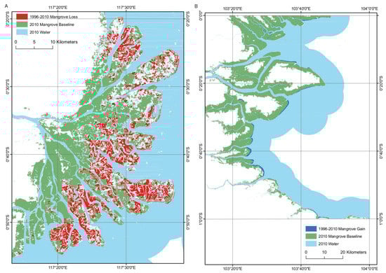 (A) Mangrove loss as a consequence of aquaculture at the Mahakam delta (B) Mangrove gain at Riau driven by the advance of mangrove seawards. Both changes were detected from 1996–2010 using 1996 JERS-1 imagery.