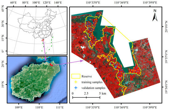 The study area is located in the northeastern area of Hainan island, including Dongzhaigang National Nature Reserve (DNNR) and its surrounding area, about 2 km outside (Figure 1). DNNR is the first National Nature Reserve for mangroves in China and a Wetland of International Importance under the Ramsar Convention. It is a typical mangrove wetland in China, consisting of the major mangrove species in southern China. It covers a total area of 3337.6 ha, of which about 1578 ha is mangrove forests. The site is characterized by a tropical monsoon climate with an annual average temperature of 23.8 °C, an annual precipitation of 1615 mm and a rainy season between May and September. The mangrove species in DNNR is very rich, and Bruguiera sexangula, Bruguiera gymnorrhiza, Ceriops tagal, and Rhizophora stylosa are dominant species.