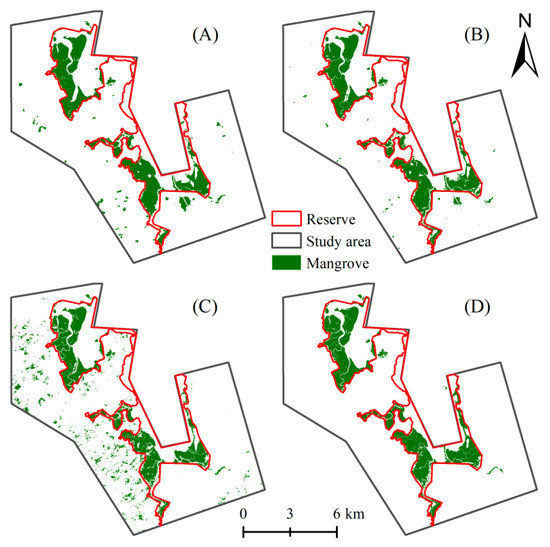 Figure 3. Comparison of (A) Landsat 8, (B) Sentinel-2, (C) Pléiades-1, and (D) manual visual interpretation based on field survey using Pléiades-1 image for mangrove extent classifications.