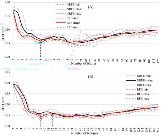 Figure 4. The out-of-bag (OOB) error estimate versus the number of features used for RFE and NRFE algorithms based on 20 runs: (A) Landsat 8; (B) Sentinel-2; and (C) Pléiades-1.