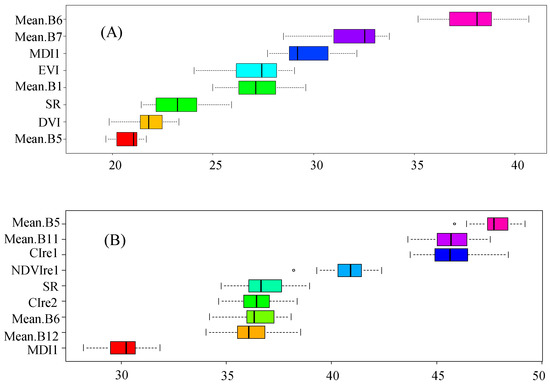 Usually, a model with a small number of variables is more interpretable and eliminating irrelevant variables might improve the predictive power [21,54]. Therefore, it is necessary to optimize the number of features for the RF model. When using the RF algorithm to select and optimize variables in remote sensing classifications or regressions, the authors usually used the non-recursive feature elimination (NRFE) algorithm to measure the importance of variables [17,21,26,55,56], since the NREF algorithm was the default method in the random Forest (rfcv function) and varSelRF (varSelRF function) package in R. NREF consists in computing the permutation importance only at the initialization of the algorithm and then following a backward strategy according to this “static” ranking (Table 5). As a consequence, the importance values of the most discriminating correlated variables are not necessarily higher than a less discriminating one, which was demonstrated by Gregorutti et al. (2017) [54] using theoretical analysis and numerical experiments. Relatively, the recursive feature elimination (RFE) algorithm recomputes the permutation importance measures at each step of variable elimination (Table 5). Consequently, it might select a smaller size and more efficient feature subset than NRFE, since the most informative variables are well ranked in the last few steps of the backward procedure, even if they are correlated [54]. The RFE and NRFE methods might obtain a slightly varied features subset every time due to different training sets. Hence the authors employed and replicated the RFE algorithm 20 times to obtain the optimal number of features and compared its performance with the results of NRFE that was also run 20 times. The reiteration time of 20 was enough to select credible and robust feature subsets, which was also recommended by Li et al. (2016) [55]. During each run, the minimum number of variables whose error rate was within one standard error of the minimum cross validation error (referred to as 1 s.e. rule) was chosen as the optimal value. Finally, the most frequent occurrence number and the corresponding features were selected as the optimal number and features, respectively. The RFE and NRFE algorithms were implemented in varSelRF package in R.