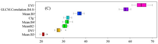 Figure 5. Ranking of image features based on the importance measure by %InSE (the percentage increase in the standard error) obtained from 20 runs of the RF for: (A) Landsat 8; (B) Sentinel-2; and (C) Pléiades-1.