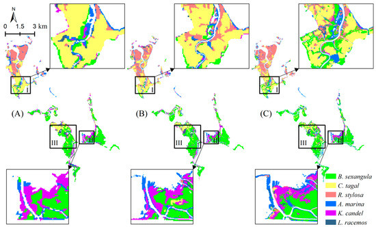 Figure 6. Comparison of (A) Landsat 8, (B) Sentinel-2, and (C) Pléiades-1 imagery for mangrove species community classifications.