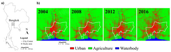 Land Use and Land Cover (LULC) maps of the Bangkok area (90 km × 90 km) for years 2004, 2008, 2012, and 2016, see Figure 1b, were retrieved by processing eight cloud-free images of reflective data measured by a Landsat-7 Enhanced Thematic Mapper Plus (ETM+) and Landsat-8 Operational Land Imager (OLI) and are reported in Table 1. Each Landsat platform covers the same area every 16 days.