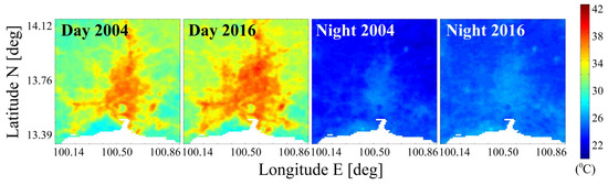 Overall, we considered all the winter and summer MODIS LST images for the four years selected, i.e., 2004, 2008, 2012, 2016: A total of 237 clear-sky images (81, 37, 50, and 69 for 2004, 2008, 2012, and 2016, respectively) were processed. Specifically, for each year, all the images were divided into daytime (10:00 and 14:00) and night-time (22:00 and 02:00). Then, they were averaged producing two mean LST images over Bangkok. In this way, a mean LST pattern for each specific year is available, with night-time and daytime considered separately, at a 1-km spatial resolution. As an example, Figure 2 reports the two average maps for 2004 and 2016.