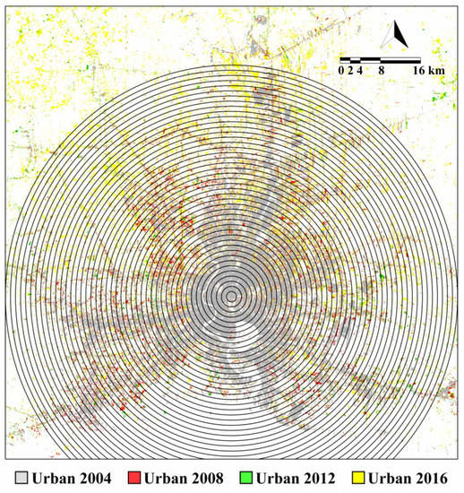 The concentric partition of Bangkok is shown in Figure 3. The city center (latitude 13°45′7″N, longitude 100°31′48″E) is positioned in the commercial core zone; overall, Bangkok exhibits a monocentric urban expansion. For the four years 2004-2008-2012-2016, the urban land density in each ring was computed considering the pixels classified as “urban” in the LULC Landsat maps, i.e., dividing the area of the urban land by the total land area of the ring. Water pixels were discarded in the density computation [23].