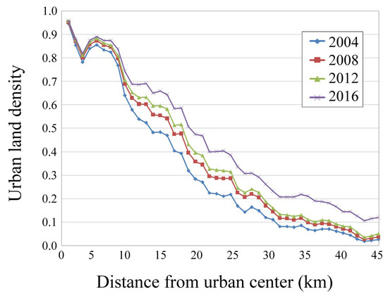 Urban land density of Bangkok versus distance from the city center, for the years 2004, 2008, 2012, and 2016. LULC Landsat maps were used to select the “urban” category pixels.