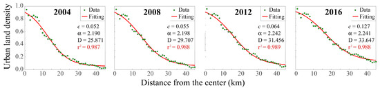 As expected, the urban density reduces away from the city center. Also, it grows with years especially in the intermediate urban areas and outskirts, with a more intense hinterland sprawl in 2016. The urban density has the maximum values in the first 8 km from the center where it does not change significantly during the years studied. The little dip at 3 km is ascribed to the presence of parks in the city core [10]. The urban land density versus distance exhibits a trend following an inverse S-shape function. Therefore, Figure 5 shows the results of the function fitting (Equation (1)) on the urban density data reported in Figure 4. The corresponding fitting parameters c, α, and D are reported as well as the coefficient of determination r2. The very high r2 values confirm the reliability of the model function in following the urban density variability.