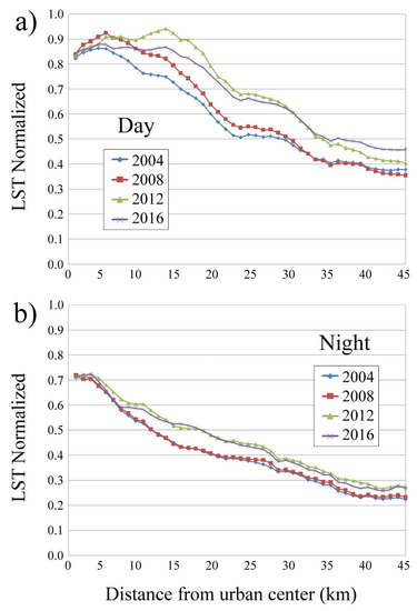 In this work, first the LSTn pattern from the eight mean LST maps of 2004, 2008, 2012, and 2016 is computed. Then, the mean daytime and night-time LSTn in each 1-km wide ring of Figure 3, discarding the water pixels, is produced. In the next section, we will show the results of this approach, the modeling and the comparison with the urban land density variation.