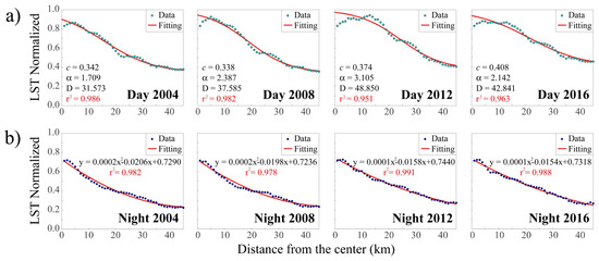 Fitting of the mean LSTn data as a function of the city center distance. The r2 is also reported. (a) daytime: Inverse S-shape function and correspondent parameters c, α, and D.; (b) night-time: Quadratic function.