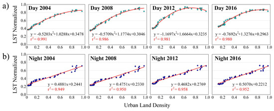 For night-time, the fitting with the highest coefficient of determination is linear, with an r2 value of approximately 0.95–0.96, whereas for daytime it is quadratic, with an r2 value of approximately 0.98–0.99. The r2 values prove the efficiency of the relationship determined for urban density-LSTn, with the daytime one exhibiting a very high accuracy. It is important to notice that the LST normalization does not alter the curve behavior with respect to the ones not normalized, the latter providing the same coefficients of determination.