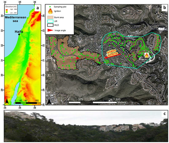 (a) Location of the study area: the city of Haifa, Northern Israel. (b) The WUI of Haifa divided into urban (UR) and wildland (WLD) domains. Post-fire sampling plots are indicated as green dots in (b). The location where the fire was ignited and fire advance direction are shown. (c) Panoramic view of the WLD as seen from west of the city (location from where the photo was taken and view angle are indicated in (b). Photo credit: Odit Abu-Thief and Alexander Eyal.